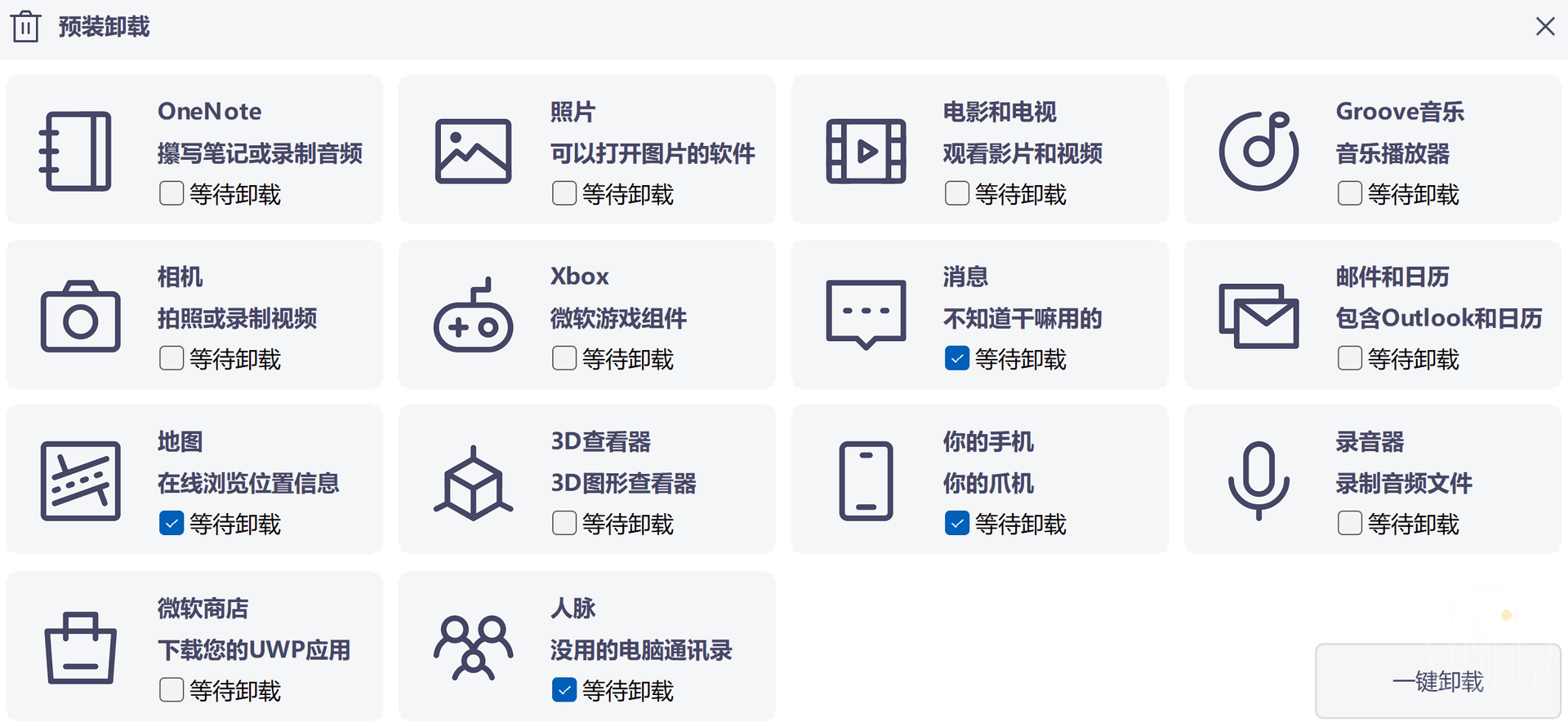“预装应用卸载”里面,把那些永远用不上的自带功能给清理掉,下面这些我直接卸载了: