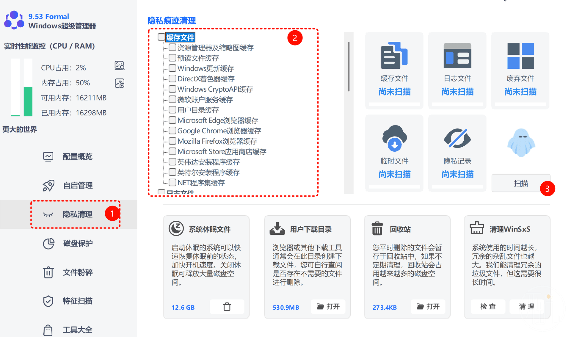 垃圾清理是先在左边勾选要清理的,再点击右边的“扫描”按钮,等扫描完成后,会有“清理”按钮。