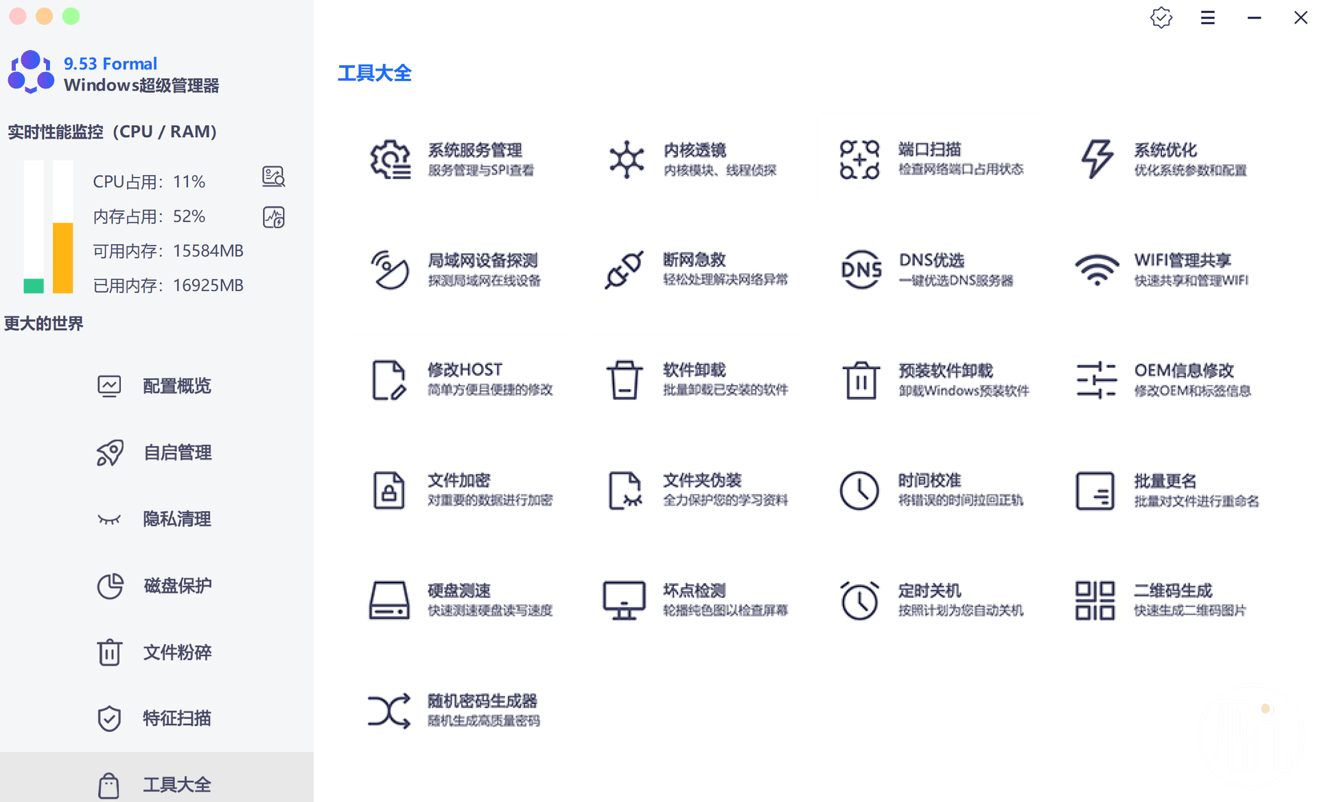 这是一个汇集了启动项目管理、垃圾清理、系统信息查看、系统优化等N多工具于一身的Windows优化工具。