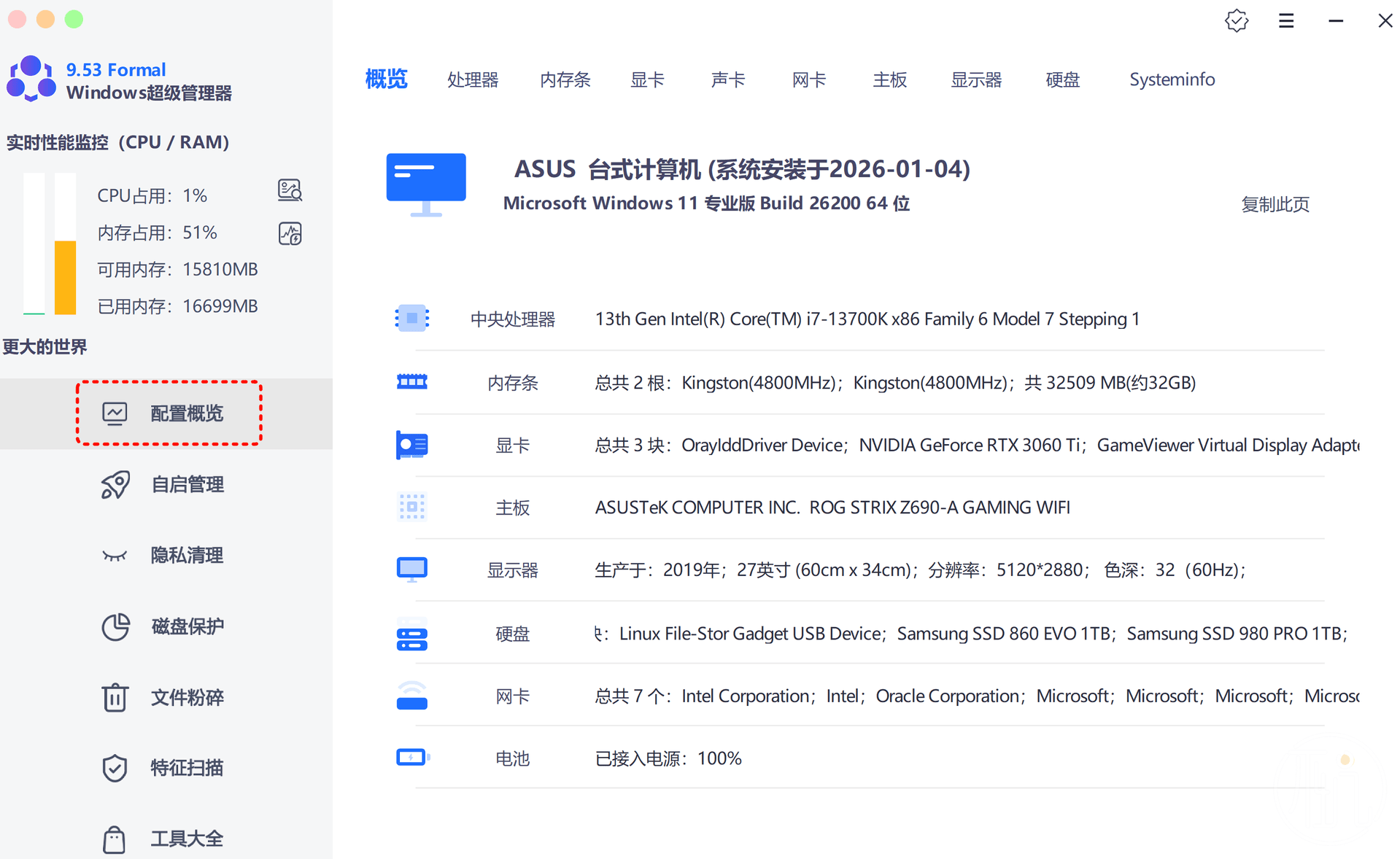 在这个版块中可以查看自己电脑的超级详细信息,比直接在系统中要详细很多。